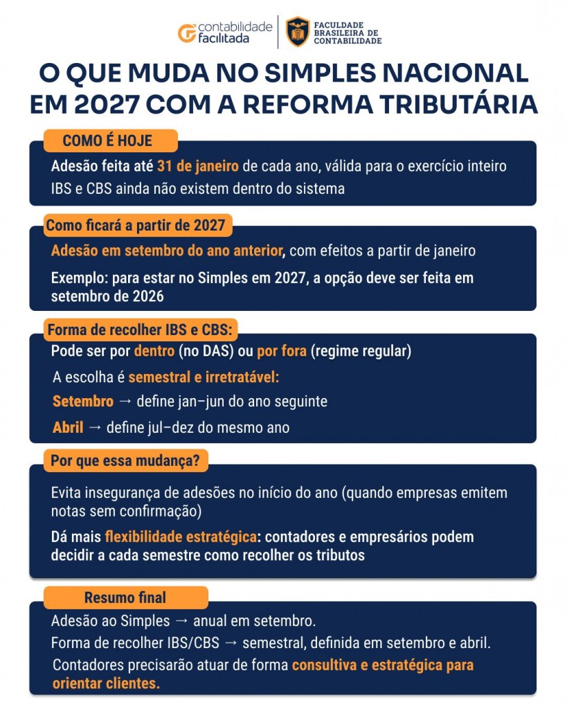 A partir da Reforma Tributária, a adesão ao Simples passa a ser feita em setembro do ano anterior, e o recolhimento do IBS e da CBS poderá ser escolhido semestralmente, com opção por dentro (no DAS) ou por fora (regime regular).